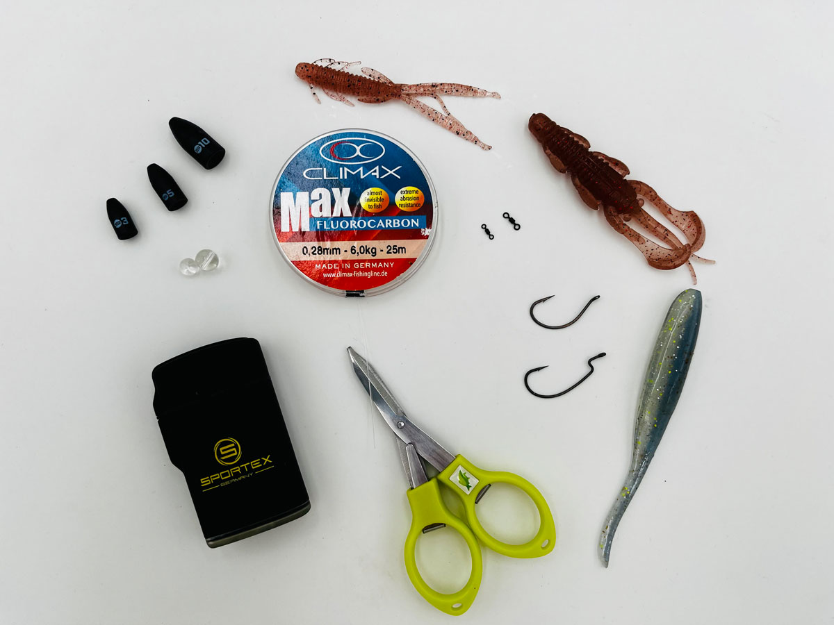 Dieses Vorfach/Rig, welches mit wenigen Kleinteilen und Fluorocarbon zusammengebaut werden kann, wird sowohl mit Krebsimitaten, als auch mit Gummifischen geangelt. Steht den gestreiften Räubern im Gewässer beides zur Verfügung, muss man schlichtweg testen, was deren aktuellen Geschmack trifft. Zum Teil sind diese nicht wählerisch, speziell jedoch im Winter, schießen sie sich auf eine Futterart ein. Das heißt für uns, dass die Köderkiste oftmals durchprobiert werden muss, bis ein fängiger Köder gefunden wird.