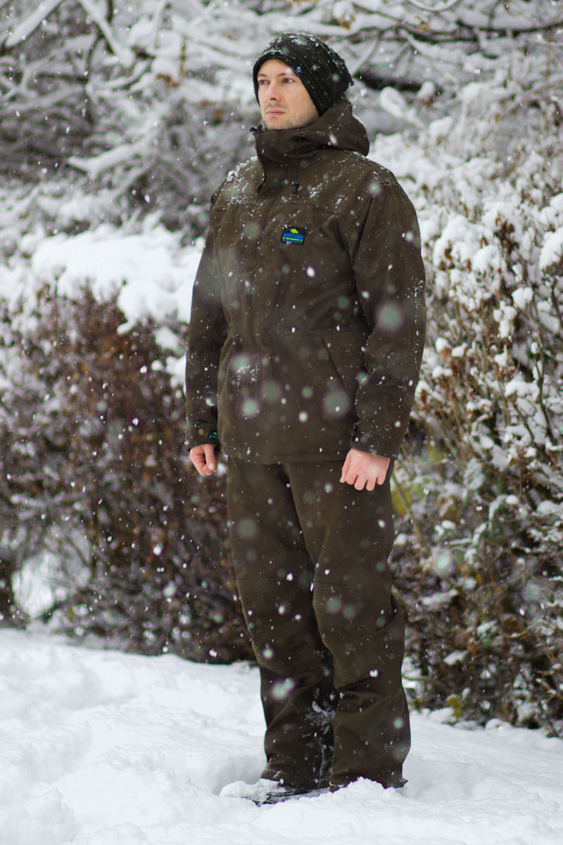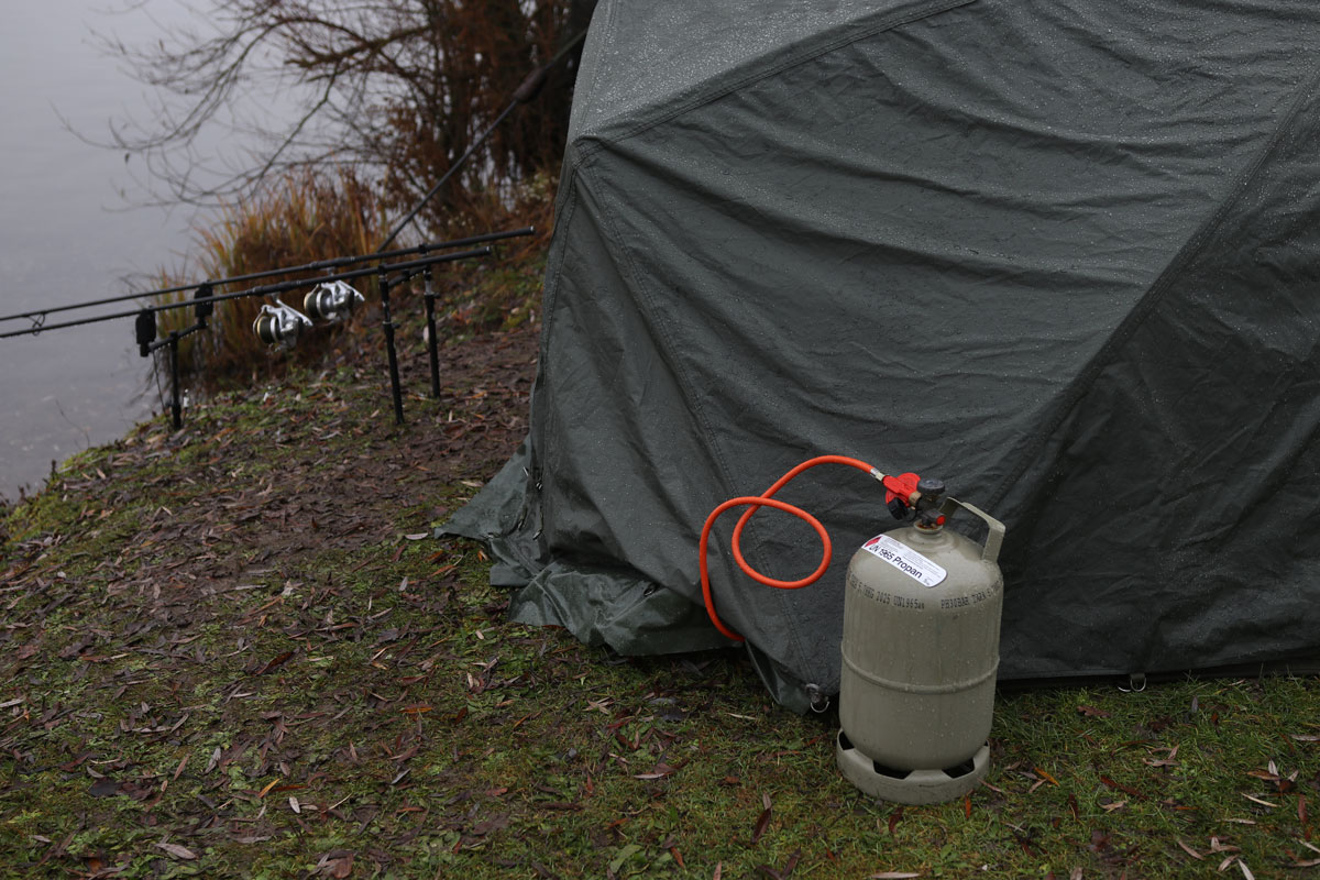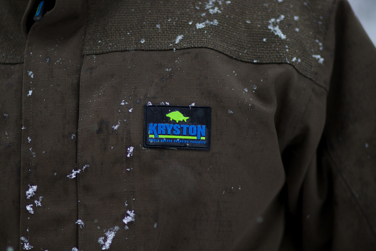 Natürlich kann man nur Fische fangen wenn man draußen ist und gerade um diese Jahreszeit muss man oft lange auf einen Biss warten. Niemand möchte dabei frieren oder den ganzen Tag mit eingezogenem Kopf im Schlafsack verbringen. Daher sollten wir uns wirklich gut gegen die Kälte wappnen mit einer warmen und vor allem wasserdichten Kleidung. Als äußere Schicht benutze ich die Kryston Session Jacke und Hose, um mich zuverlässig gegen Nässe schützen zu können. Kurz auf der Abhakmatte in etwas Wasser hineingekniet ist dies im Sommer etwas ärgerliches, im Winter kann es jedoch das Ende der Angelsession bedeuten. Warme Schuhe runden das Ganze ab und wir können so eingepackt, draußen weiterhin aktiv sein. Während des Tages läuft bei mir die Zeltheizung ständig durch und sorgt für wohlige Wärme unterm Schirm.