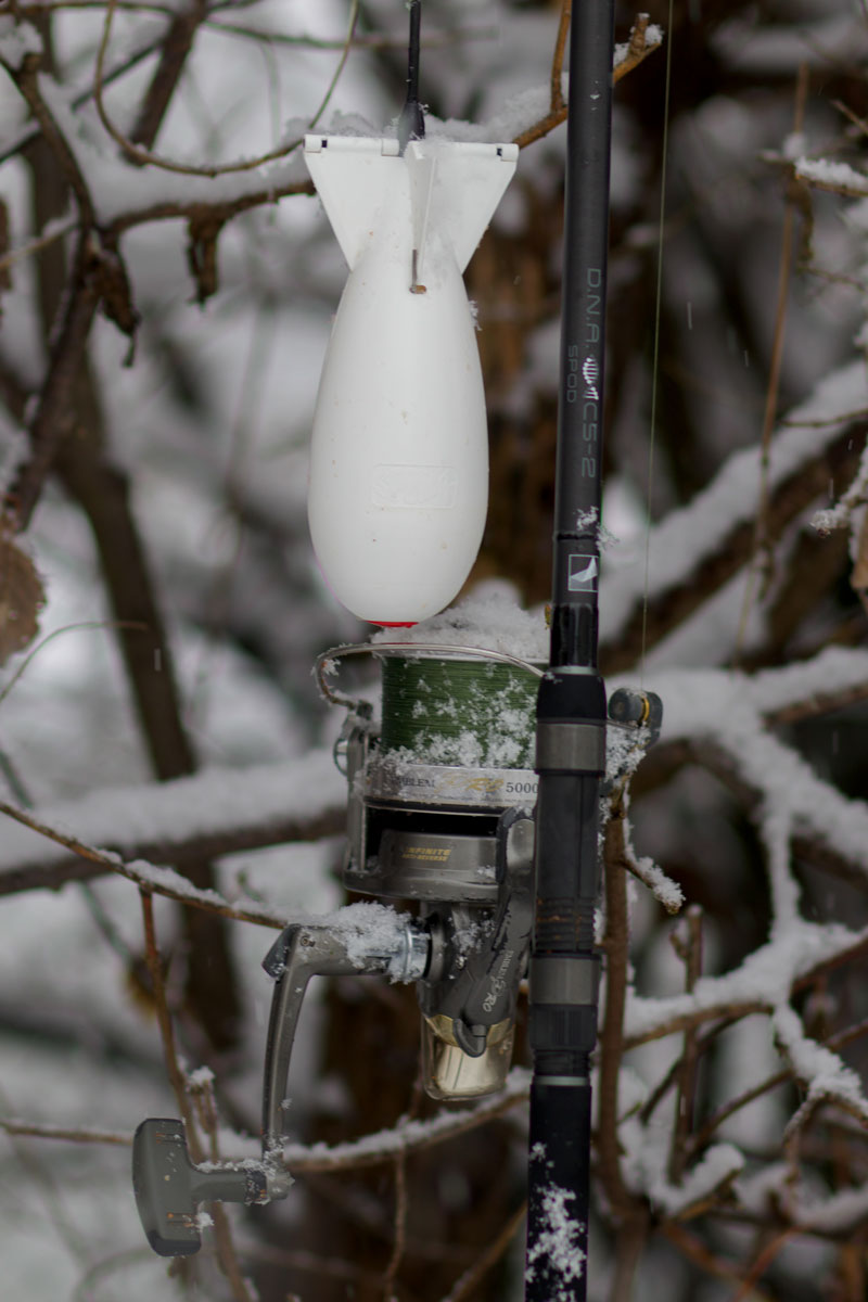 Auch mit Futter sollte man eher sparsam umgehen, weniger ist hier definitiv mehr! Wer über den Herbst schon einen guten Futterplatz aufgebaut hat, ist hier klar im Vorteil und kann normal auch noch bis spät im Jahr mit Bissen rechnen. Ansonsten animiert ein kontinuierlicher, geringer Futtereintrag die Fische nun noch weiter nach Nahrung zu suchen. Halten sich die Weißfischaktivitäten in Grenzen, sollte man mit der Ködergröße nach unten gehen, auch um das Auswaschen des Köders beim kalten Wasser zu beschleunigen. Der Winter ist die Zeit von attraktivem, löslichem Futter und Teig. Durch die vielen umherschwebenden Partikel sorgt dieses für einen geschmacklichen Reiz am Spot. Entscheidend ist, dass das wenige Futter auch genau über unsere Montagen gelangt. Eine gute Spod-Rute sowie genau abgeclippte Schnurlängen sind dafür unerlässlich. Dafür benutzte ich eine Sportex DNA-CS2 Spod in 13ft und 5,5lbs, die mit ihrer straffen Aktion alles zielsicher auch auf weit entfernte Plätze befördert.