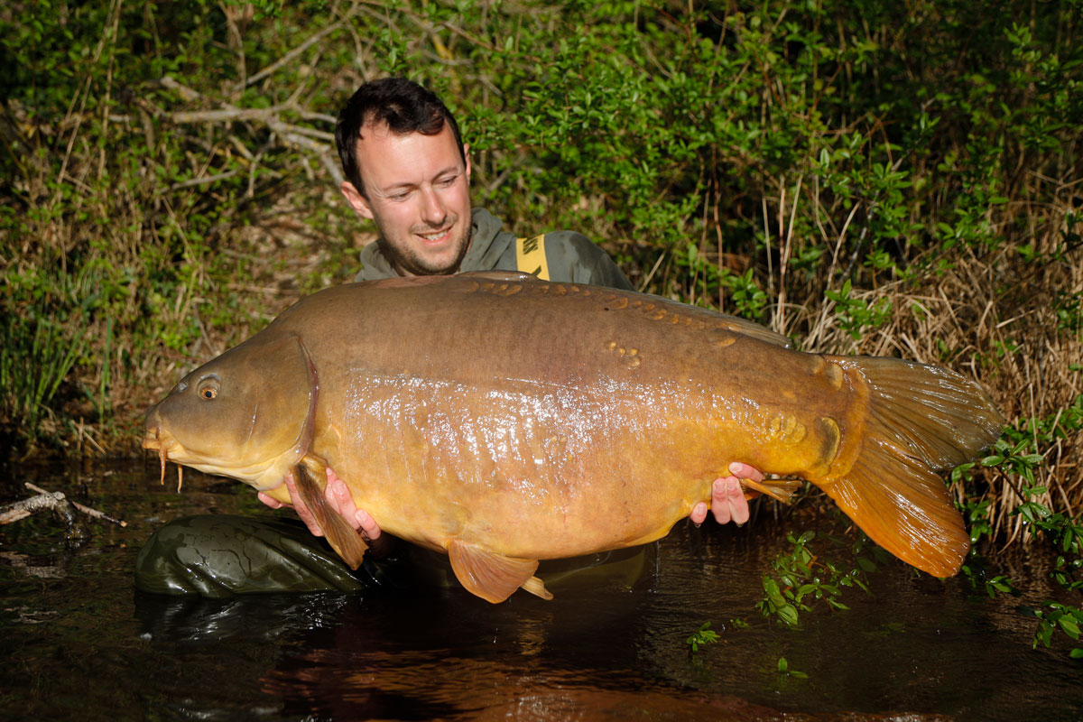 Am späten Nachmittag dann die nächste Aktion, diesmal auf der Rute mitten im See. Der Fisch machte ungewöhnlich viel Druck und stand trotz des eher seichten Wassers stets fest am Grund. Dort zog er gemächlich seine Bahnen und ich folgte ihm mit dem Boot, halb durch Motorkraft und halb vom Fisch hinterher gezogen. Ziemlich verdächtig. Als er sich das erste Mal der Oberfläche näherte sah ich eine helle Flanke – doch kein Wels! Zur Sicherheit machte ich die Bremse sofort wieder einen Ticken lockerer, da der Fisch wieder nach unten wollte. Die Rute federte die Fluchten und starken Kopfstöße gut weg. Allmählich wurden die Fluchten aber kürzer und der Karpfen durchbrach noch ein zwei Mal die Wasseroberfläche, bevor ich dann einen ersten Kescherversuch starten konnte. Der misslang jedoch und der Fisch setzte wieder zum Sprint an, die Rutenspitze klebte die ganze Zeit förmlich an der Wasseroberfläche. Beim zweiten Anlauf gelang es dann aber und ich konnte den massiven Spiegler sicher einnetzen. Darauf folgte ein Fotoshooting im Wasser bei der tief stehenden, französischen Frühlingssonne. Gibt es etwas Besseres?