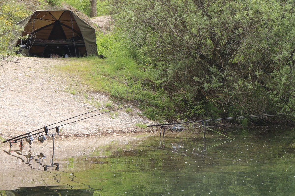 Bei bestem Wetter kam ich schließlich nach langer Fahrt endlich am Zielgewässer an. Ein kleiner Baggersee mit viel Kraut, glasklarem Wasser und mit der Chance auf einige wunderschön gezeichnete Fische sollte es für die nächsten Tage sein. Es war bereits einiges am See los und ich beschloss nicht voreilig einen Platz zu beziehen, sondern erst nach einer Runde um den See und ausgiebiger Stellensuche vom Land und zu Wasser. Gesagt, getan! Und nach einem halben Tag rumfahren, laufen und einigen Gesprächen mit den anderen Anglern entschied ich mich schließlich für eine Seite des Sees. Als ich gerade mit dem Boot an der anvisierten Stelle anlanden wollte, merkte ich, dass genau dort gerade jemand mit dem Aufbauen anfing. Mist! Jetzt schnell zum zweiten interessanten Platz, bevor noch jemandem einfällt, dorthin zu gehen. Denn die letzten Tage wurde scheinbar überall nur wenige, halbstarke Fische gefangen. Zu meiner Erleichterung war an der neuen Stelle aber niemand und ich konnte meine kleine Behausung für die nächsten Tage aufstellen. Sicherlich kenn jeder dieses wunderbare Gefühl des zur Ruhe Kommens, wenn man nach langer Fahrt und allen möglichen Strapazen, endlich angekommen ist.